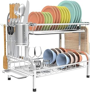 水切りラック 2段式 304ステンレス製 大容量 食器 水切りかご 箸立て 包丁スタンド まな板立て 組み立て簡単 (シルバー)