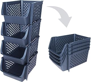 Skywin プラスチック積み重ね可能ストレージビン パントリー用 - 4個パック ブラック 積み重ね可能 食品 キッチン 浴室の整理に 必需品