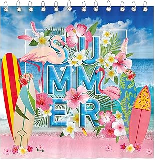 Funnytree サマートロピカルビーチシャワーカーテンセット フック付き フラミンゴ シーサイド ヤシの木 海 サーフィン ボード バス ハウス バスルーム バスタブ 装飾 お手入れ簡単 防水 洗濯可能 丈夫 ポリエステル生地 72インチ×72インチ