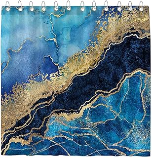 Funnytree ブルーマーブルシャワーカーテン 抽象ネイビーゴールドパターン 質感 ラグジュアリーバスルーム装飾 ホームバスタブセット フック12個付き お手入れ簡単 防水 洗濯可能 ソフト 丈夫 ポリエステル生地 72インチ×72インチ