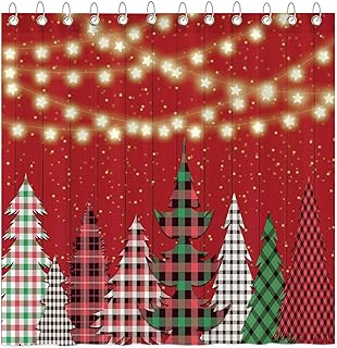 Funnytree クリスマス 冬用 シャワーカーテンセット フック12個付き レッドウッドフロアチェック柄 メリークリスマスツリー装飾 お手入れ簡単 防水 洗濯可能 丈夫なポリエステル生地 72インチ×72インチ
