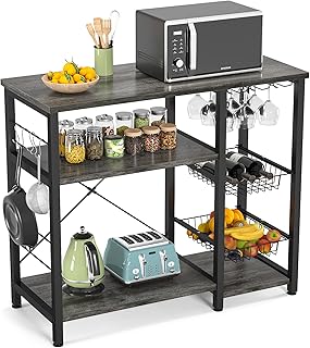 Ecoprsio キッチンベーカースラック ユーティリティ電子レンジスタンド スパイス用 4段 3段 コーヒーバーテーブル ワイングラスホルダー付き フック5個 素朴なブラウン