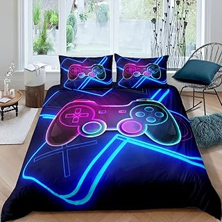 キッズゲームパッド寝具セット ティーンゲーマー掛け布団カバーセット 男の子 子供 女の子 ビデオゲーム装飾 掛け布団カバーセット グラデーションブルー モダンゲームコントローラー キルトカバー 枕カバー2枚付き 寝具3枚 フル