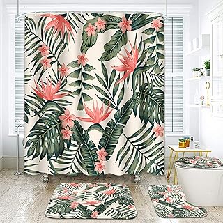 ArtSocket シャワーカーテン4点セット ビーチ 陽気 トロピカル ダークグリーンリーフ ヤシの木 花 鳥 パラダイス 滑り止めラグ付き トイレの蓋カバーとバスマット バスルームの装飾セット 72インチ x 72インチ
