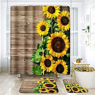 ArtSocket シャワーカーテン4点セット ひまわり 木製ボード ヴィンテージ 鮮やかなイエロー 滑り止めラグ トイレ蓋カバー バスマット バスルーム装飾セット 72インチ x 72インチ