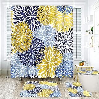 ArtSocket シャワーカーテン4点セット 春 花柄 ブルー イエロー ネイビー 花 グリーン 抽象 グレー プラント アスター リーフ 自然 滑り止めラグ トイレ蓋カバー バスマット バスルーム装飾セット 72インチ x 72インチ
